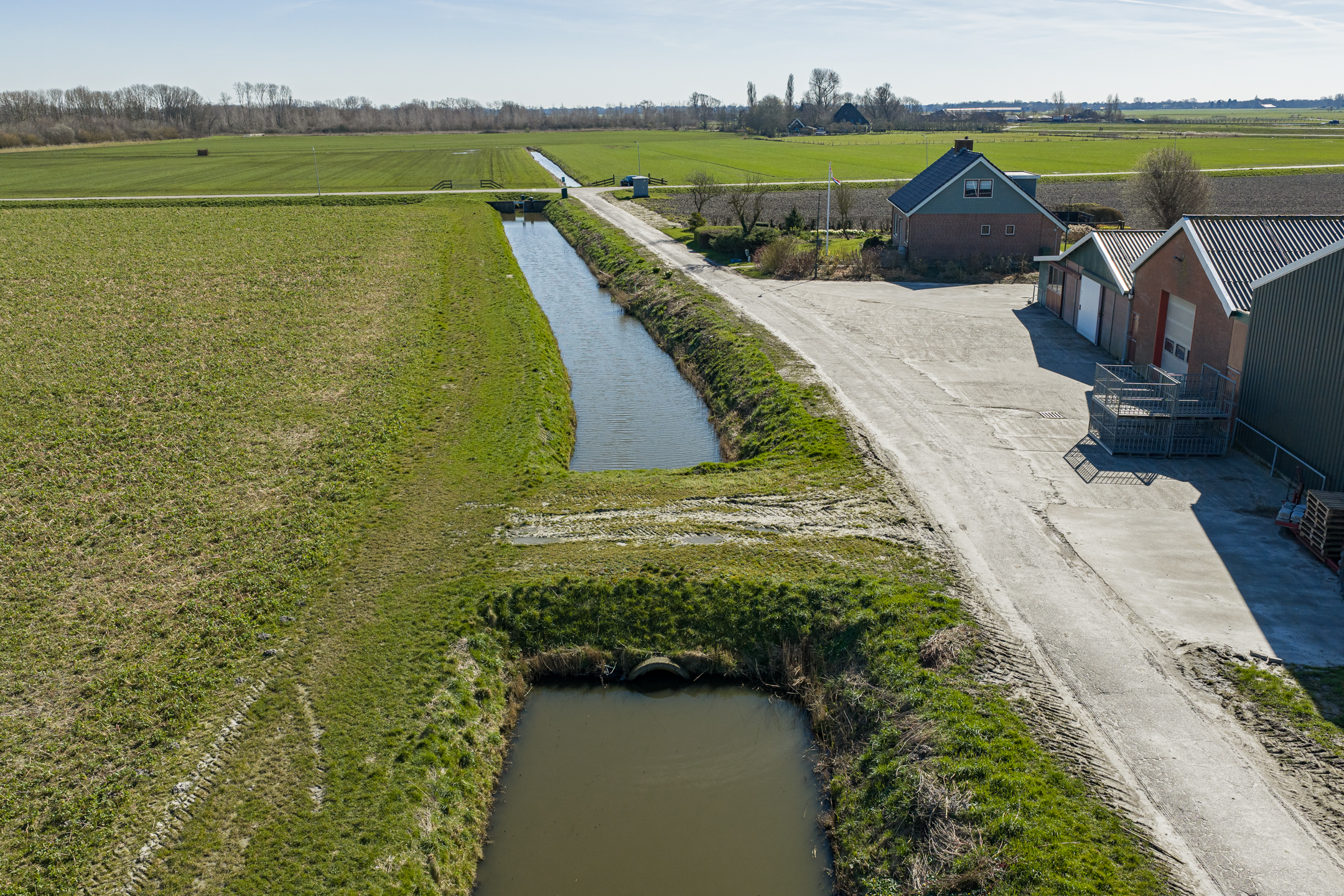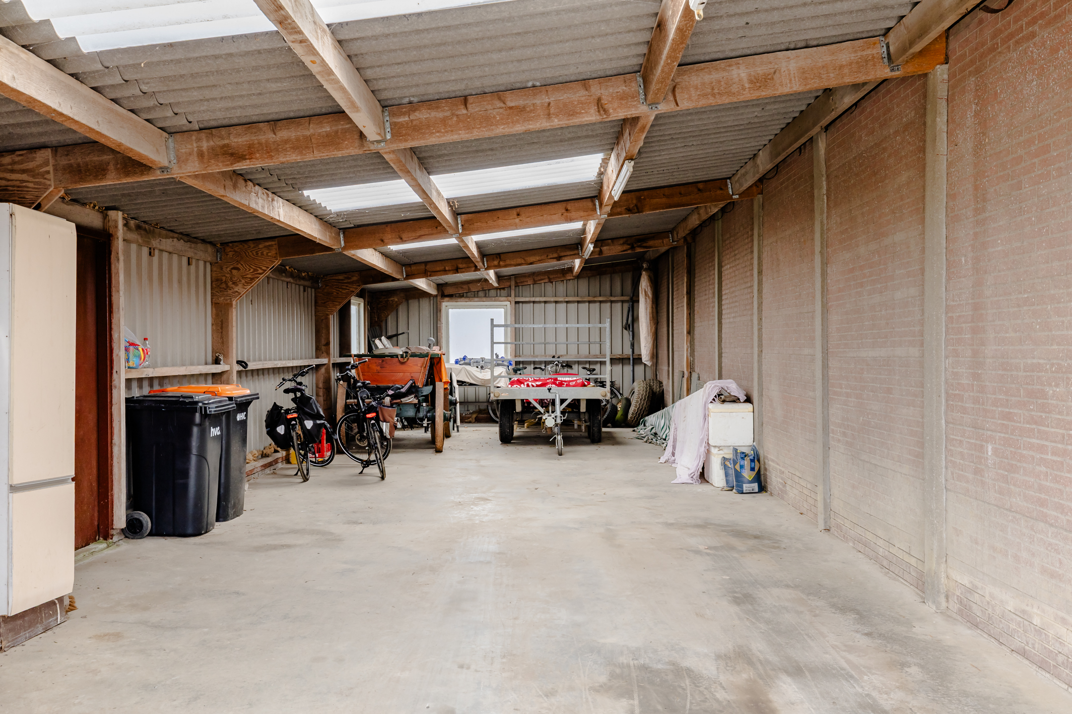 Op het erf bevinden zich een ruime schuur, twee koelcellen en een berging, geschikt voor diverse agrarische- of opslagdoeleinden. De schuren zijn voorzien van 138 zonnepanelen, wat bijdraagt aan een duurzame bedrijfsvoering. Het geheel beschikt over circa 8 hectare cultuurgrond, grotendeels gelegen rondom het erf en verdeeld over meerdere percelen. De grond betreft kleigrond en zavel en is goed ontsloten via meerdere dammen naar zowel de Huiskebuurtweg als de Molenweg.